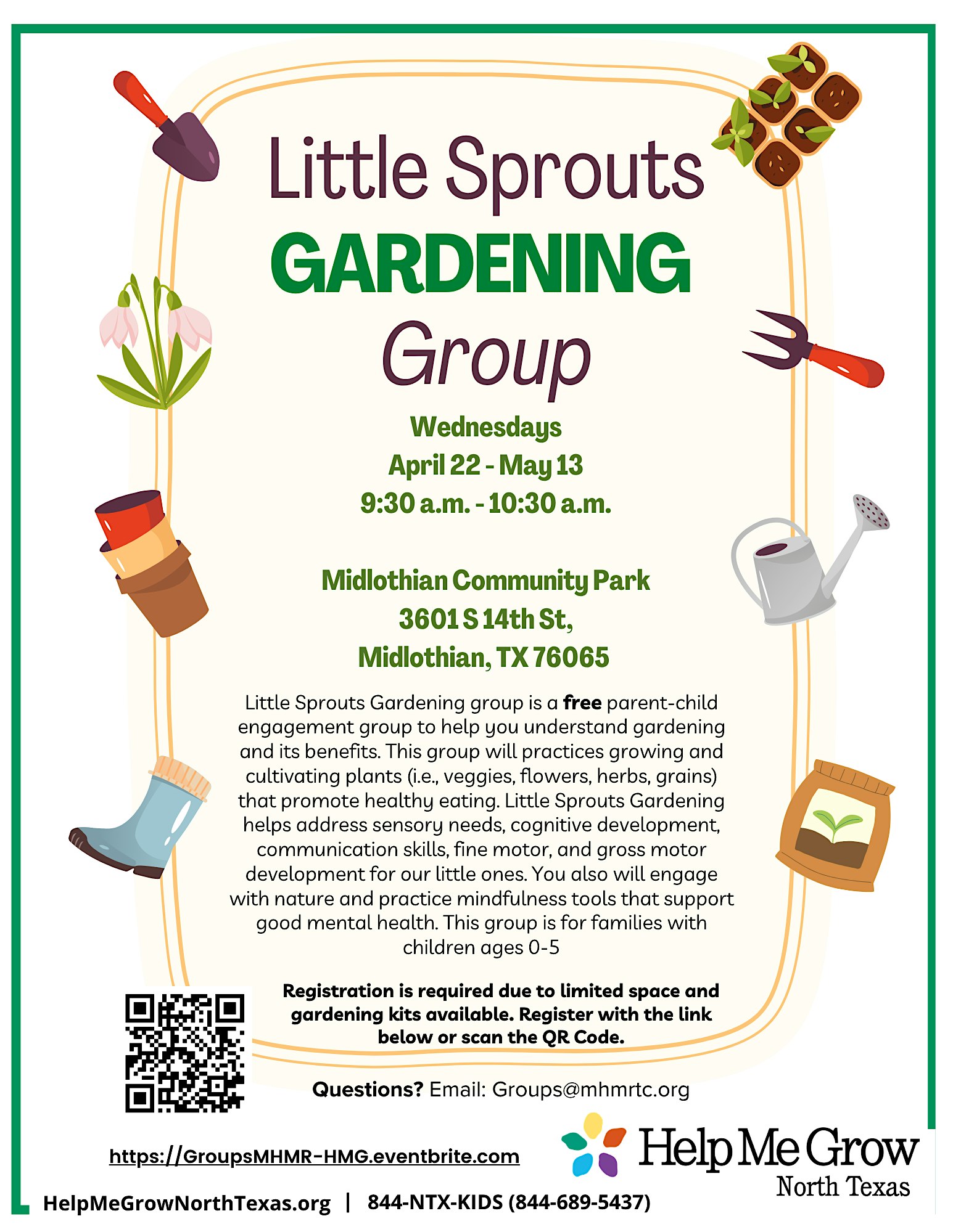 Face to Face Little Sprouts Gardening Group-Midlothian April 29 @ 9:30 am - 10:30 am Midlothian Community Park 3601 South 14th Street, Midlothian, TX, United States Come and play with us!