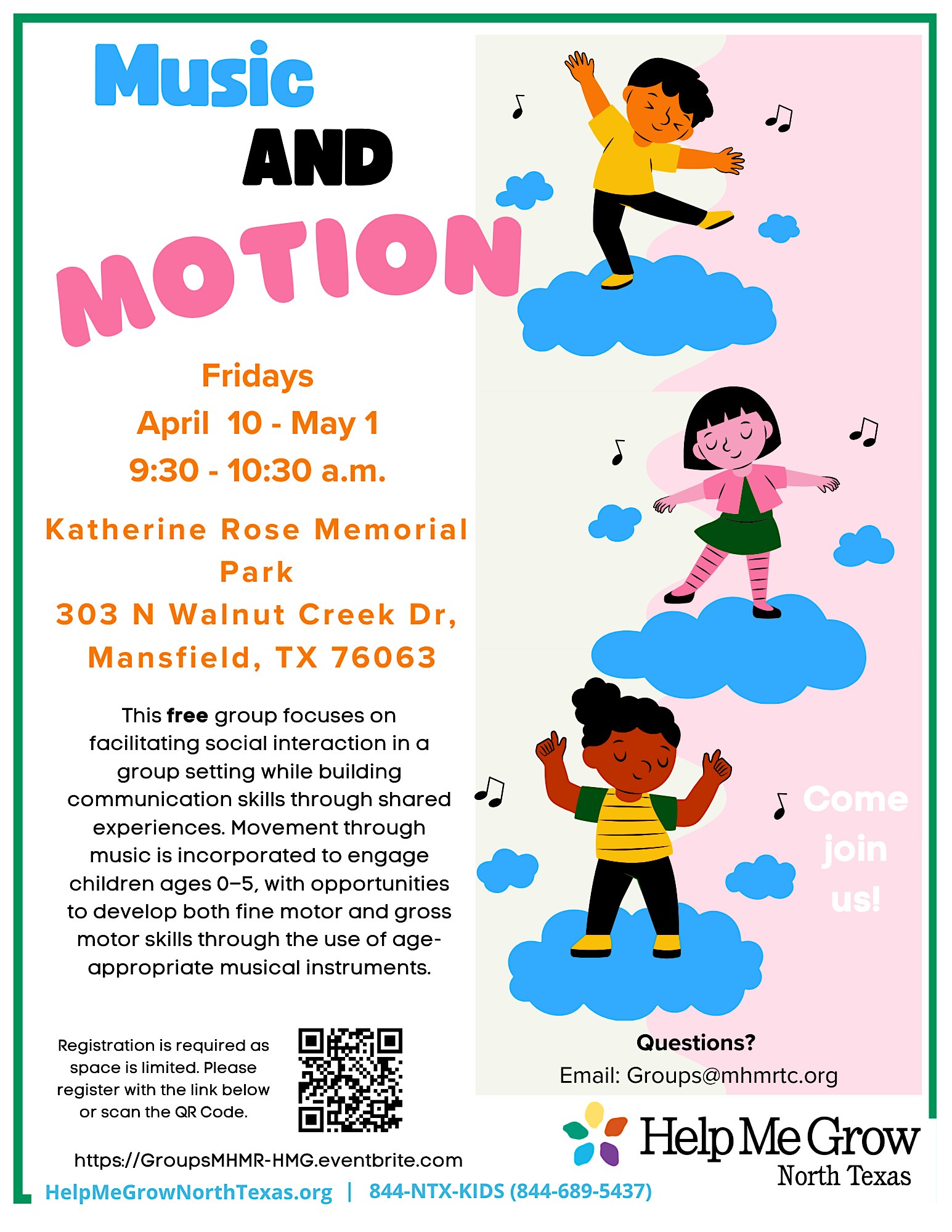Face to Face Music and Motion – Mansfied April 10 @ 9:30 am - 10:30 am Katherine Rose Memorial Park 303 North Walnut Creek Drive, Mansfield, TX, United States Come Join us!